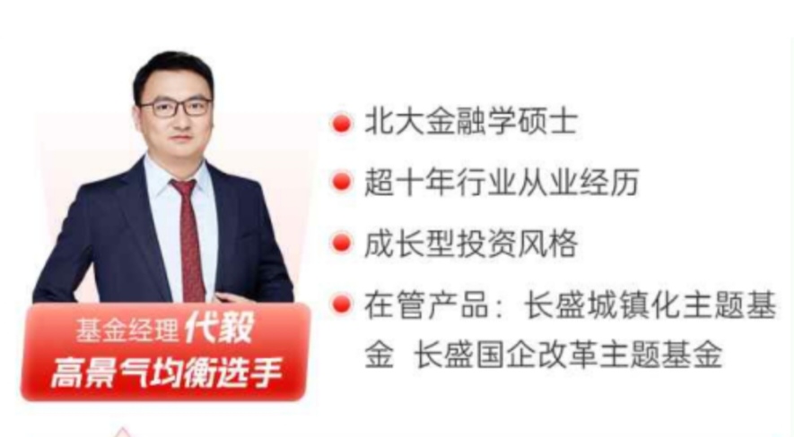 长盛基金经理代毅,北京大学金融学硕士,超 10 年行业研究经验。2010年7月加入长盛基金管理有限公司研究部,曾任行业研究员、基金经理助理等职务。现任长盛城镇化主题混合型证券投资基金基金经理。曾任长盛动态精选证券投资基金基金经理。2020年4月21日起担任长盛国企改革主题灵活配置混合型证券投资基金基金经理。2019年05月22日至2020年05月27日任长盛同盛成长优选灵活配置混合型证券投资基金(LOF)基金经理。曾任长盛生态环境主题灵活配置混合型证券投资基金基金经理,投资经验丰富。