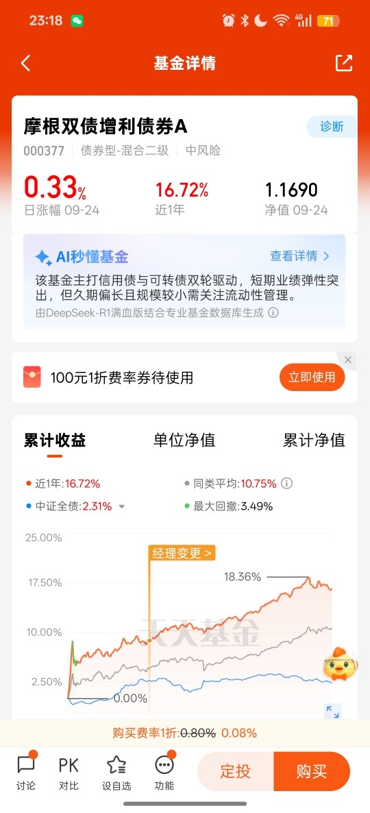 $摩根双债增利债券A$ 摩根双债增利是信用债+可转债的组合,信用债负责提供稳定票息,可转债负责在股市行情好的时候增厚收益,近一年大幅跑赢同类平均,而且波动比较小,净值修复快,充分验证了其策略的有效性。而且我注意到这只基金机构持仓占比特别高,说明专业投资者也认可其策略,我觉得稳健型投资者确实可以考虑这只基金。@摩根资产管理