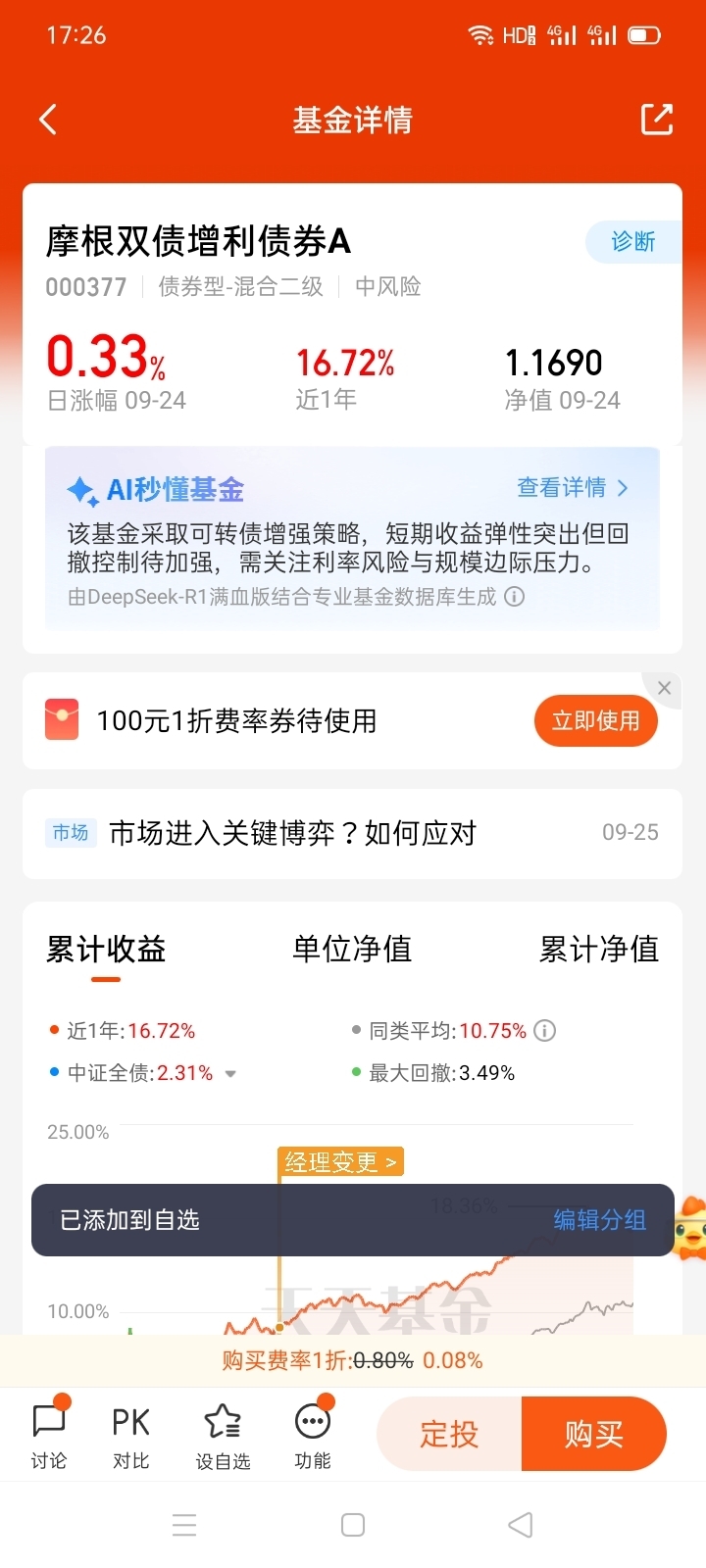 • 近1年涨幅17.21%,远超同类平均4.34%,在二级债基中排名前3%。