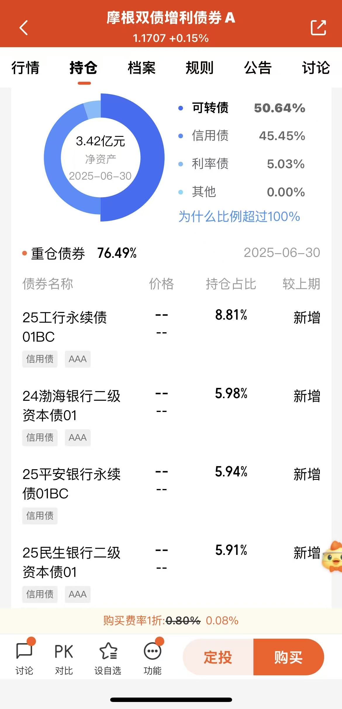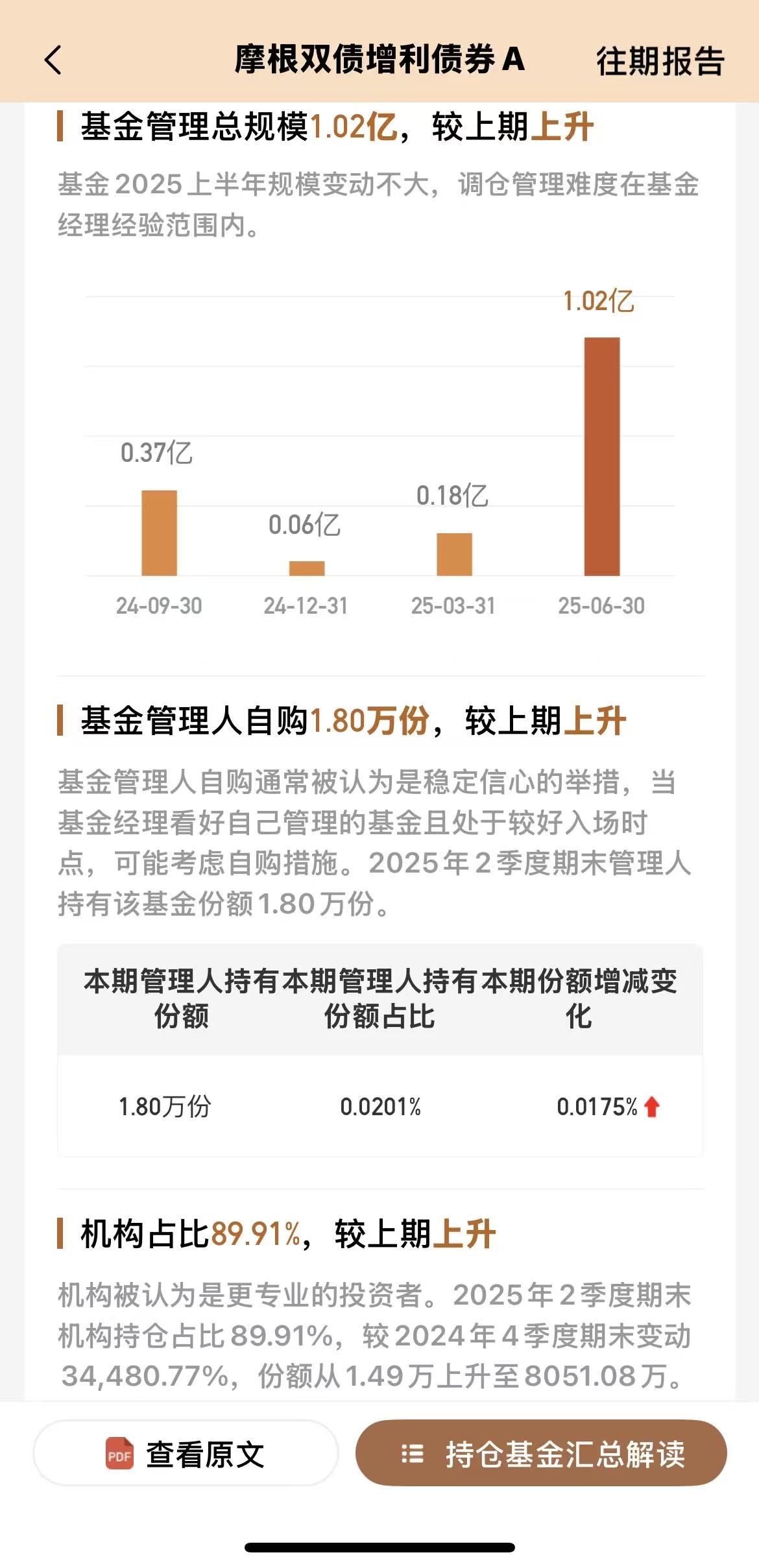 综上所述,摩根双债增利债券基金不持有股票,只持有可转债和信用债、利率债,对于稳健型投资者来说,是别具一格的产品,值得关注和拥有,对于喜欢可转债交易,又没时间关注的小伙伴来说,也不失为一种选择,对于进取型投资者来说,也可以考虑把它作为资产配置的一部分,我已把它加入自选,等待布局。@摩根资产管理
