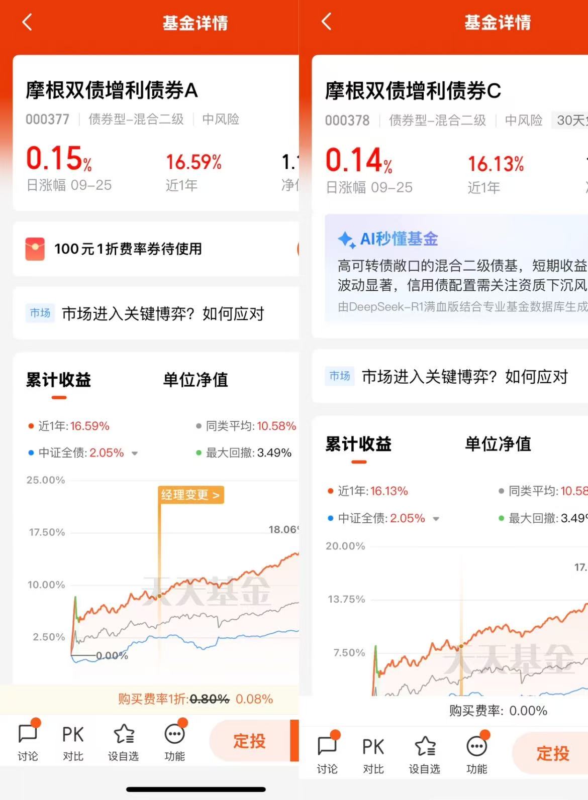 比如摩根资产管理的双债增利债券基金,顾名思义,所谓双债,就是信用债+可转债,信用债主要为高等级的债券,可转债大家都知道,为T+0,而机构相对也更容易获取打新收益,在牛市中有更大的行情机会,这里我们可以把可转债类比为权益类产品,因为它本质上具有股权属性,当前处于牛市,可转债对应的股票价格上涨,则转股价值随之增加,可以获得股票增值的收益,也正因如此,本基金近一年收益率达到16.59%,同期最大回撤3.49%,假如我们去年9月25日申购20万元,则200000/1.0041=199183份额(手续费忽略不计),按照今年9月25日净值计算,为199183*1.1707=233184元,近一年约可得3.3万元收益;