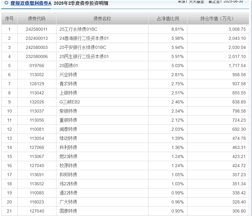 截至二季度,本基金持有可转债50.64%,信用债45.45%,利率债5.03%,如25工行永续债01BC、25民生银行二级资本债01、25国债01、兴业转债、青农转债、上银转债等,
