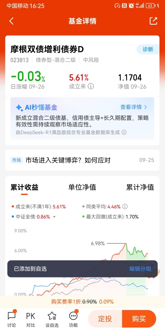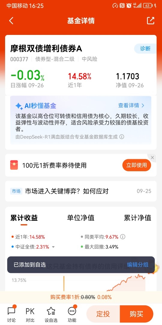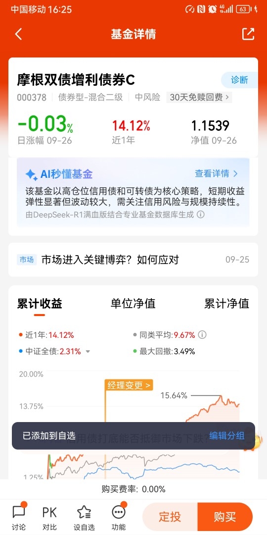 首先,从业绩走势图,我们可以看到,近一年$摩根双债增利债券A$ 涨幅超14%,虽然近一个月有所回撤。表现对于债基而言,已经是相当优秀了!