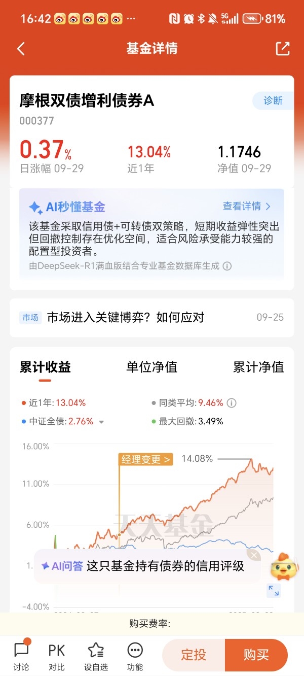 直到前阵子刷天天基金测评,看到“摩根双债策略”介绍时,还注意到基金经理的履历,瞬间眼前一亮。这位经理有10年固收投资经验,其中5年专门做“信用债+可转债”组合,最厉害的是他的“逆向调整”能力:2022年大家都在追高可转债时,他减仓到15%;2023年利率下行,大家都慌着卖信用债时,他反而加仓了高评级短久期品种,结果那年收益比同类平均高0.6个点。再看现在的策略,信用债选AAA级、短久期,可转债挑低溢价、高景气度的,搭配他对市场的判断,简直是为对抗利率下行量身定做。对比了同类型基金,他管理的这只近一年收益和最大回撤都排前列,已经把利率债基的钱转进自选,有这样的基金经理掌舵,终于不用再迷茫了!$摩根双债增利债券A$ $摩根双债增利债券C$