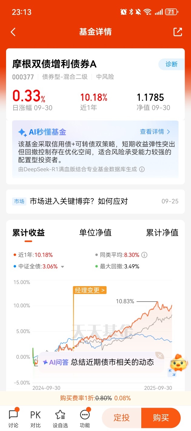 最让我改观的是它的风控体系。基金经理周梦婕把组合久期牢牢控制在2年左右,远低于同类产品的4-5年,这意味着利率波动对净值的影响更小。2025年6月央行降息预期升温时,我身边有人急着买长债基金,我却看着这只基金通过小幅加仓短债捕捉收益,净值稳步上涨,这才懂“稳健操作”比“赌政策”更可靠。