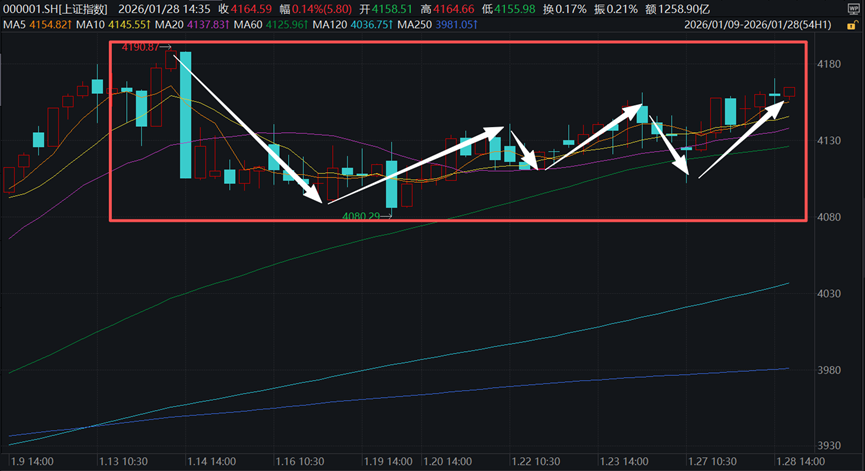 今天市场又是个震荡调整的格局,上证指数在4130点附近反复拉锯,这种行情其实从1月中旬开始就挺常见的,结构性分化特别明显——前期涨得多的商业航天、电网设备等题材板块出现回调,但贵金属、光伏等受益于国际金价创新高和马斯克太空光伏消息的板块反而逆势走强,这种"慢牛"其实对普通投资者来说挺难做的,因为选错方向就是赚指数不赚钱,甚至亏钱。