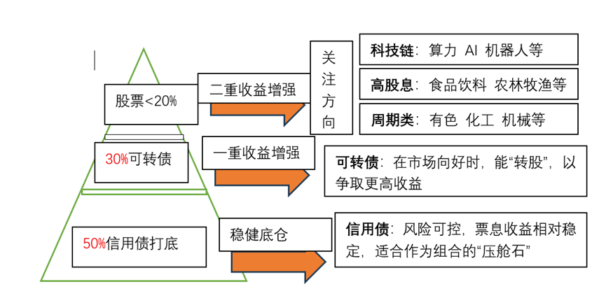 从今年的市场展望来看,这种策略的优势或许会更明显:信用债这边,经济弱复苏背景下,高等级信用债的票息收益还是比较确定的;可转债虽然估值不低,但结构性机会还是有的,特别是一些正股基本面好、溢价率相对合理的个券;股票这边,虽然整体波动大,但红利、高股息这些防御板块还是有配置价值。更重要的是,这三个资产在不同市场环境下的表现周期不一样,比如利率下行时债券涨,股市反弹时转债和股票涨,通过动态调整配比,理论上能实现"东方不亮西方亮"的效果。