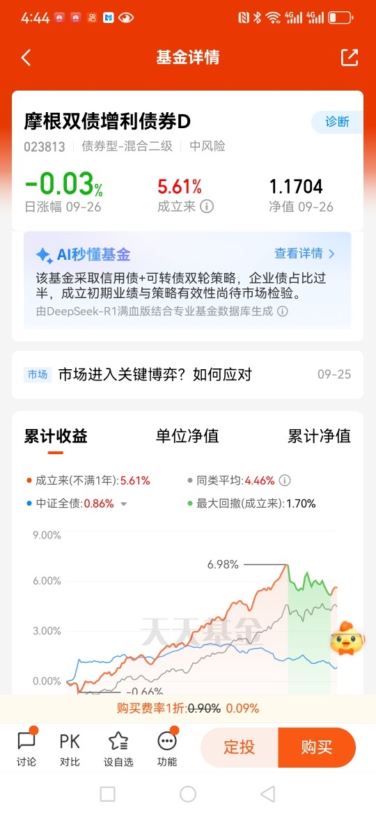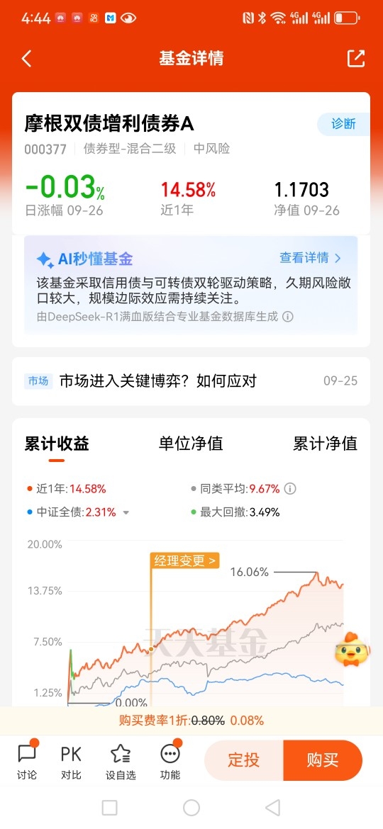 行情这么火热,大家还是可以继续添混债,$摩根双债增利债券C$ 这只,回撤不算大,收的蛋也不小,不管是近期还是近半年,近一年,它都涨得比同类多,它是纯债+可转债策略,这种混债波动会相对小一点,也是含有可转债的。大家可以根据自己的偏好来,适合自己的才是最好的。