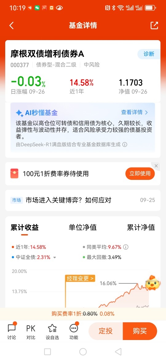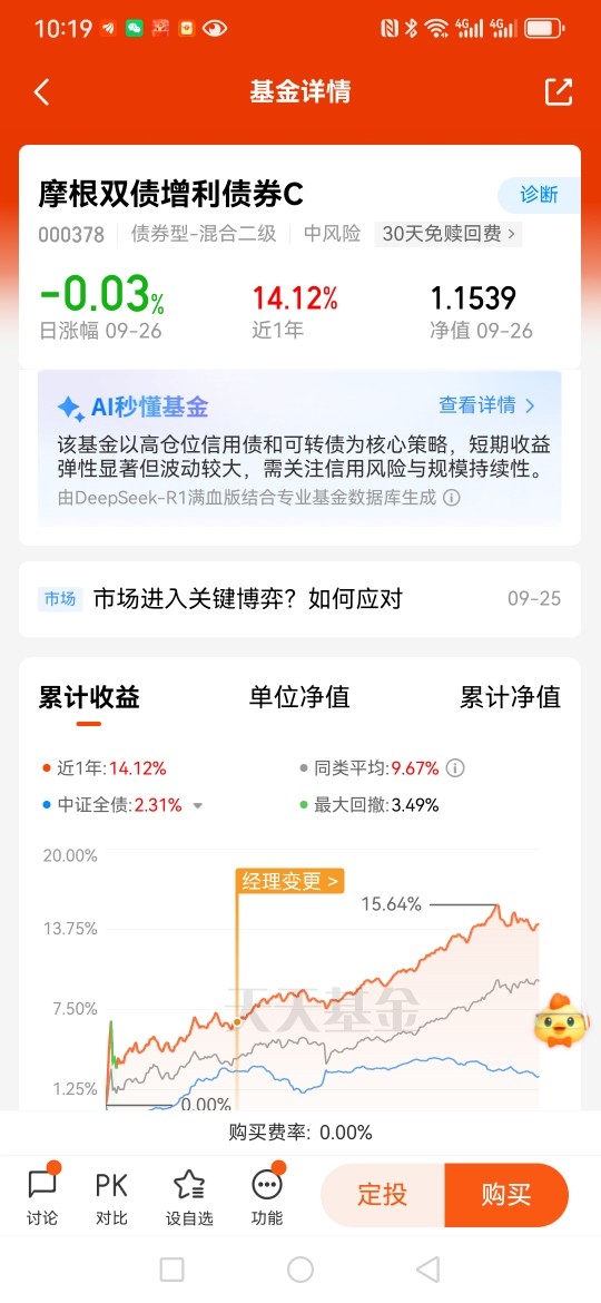 现在纯债基金的表现真是一言难尽,给人一种跌跌不休的感觉。所以,今年单靠纯债收益真难做。$摩根双债增利债券C$ 这支固收+波动的双债策略基金波动不大,很多时候比很多纯债基金都抗跌,在今年大盘行情走强的背景下,性价比凸显,一年下来近15个点,优于很多混债基金。整体表现能涨抗跌,拿着不操心,可以密切关注一下。