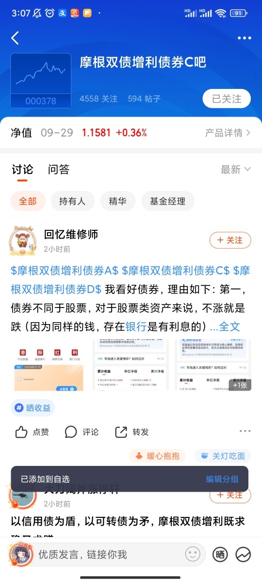 看好$摩根双债增利债券C$ ,国庆将至,债券基金哪怕节假日也能为我们带来收益,满满的幸福感。今年的市场持续震荡走势,选择风险低,收益相对稳定的债基可以有效的提高我们的持有幸福感,毕竟相对于大起大落,我更喜欢稳稳的幸福!我自己在闲钱理财的选择上也是一个只考虑符合这样特征的债券基金。