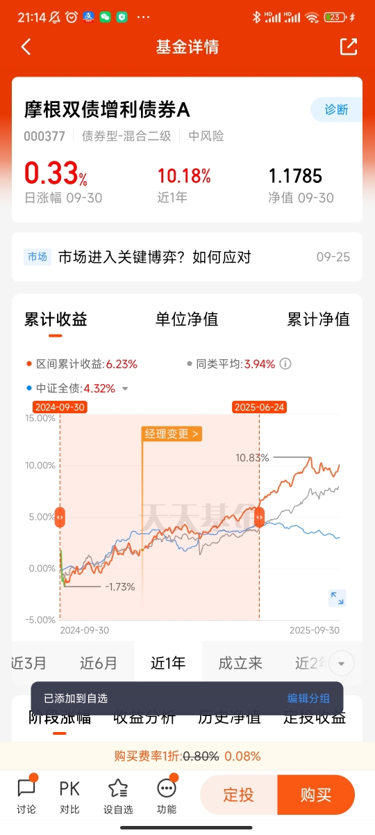 收益表现:该基金展现出“稳中有活”的特质。近一年A类份额涨幅达19%(截至2025年8月),大幅超越同类平均,长期表现同样稳健,成立以来年化回报超过6%。这意味着它在追求长期稳健增值的同时,也具备一定的收益爆发力。