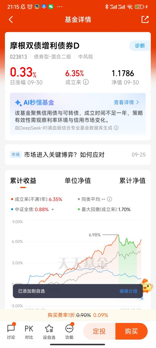 风险控制:作为一款非纯债基金,其波动会高于纯债基金。近一年最大回撤为-3.49%(亦有数据为-5.58%),高于纯债基金,但远低于偏债混合基金和股票基金。一个关键的风险收益性价比指标——夏普比率高达2.66,意味着每承担一单位风险所获得的超额回报非常可观,优于绝大多数同类产品。