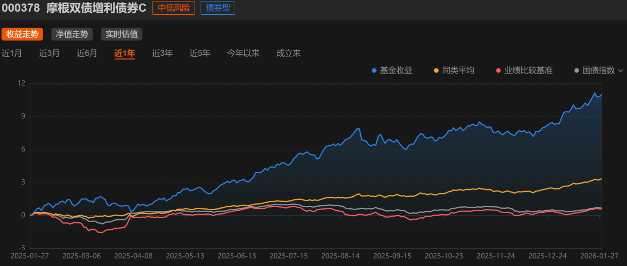 今天要重点聊的这只基金——$摩根双债增利债券C(OTCFUND|000378)$,就是这种"固收+债券+股票+转债"策略的典型代表。先看业绩:今年以来涨了2.44%,在同类产品里排名靠前;更难得的是,从2025年以来的走势看,净值基本是一条斜线向上,几乎没怎么回撤,最近更是连续上涨。这种"稳中有进"的表现,在当下的震荡市里显得格外珍贵。