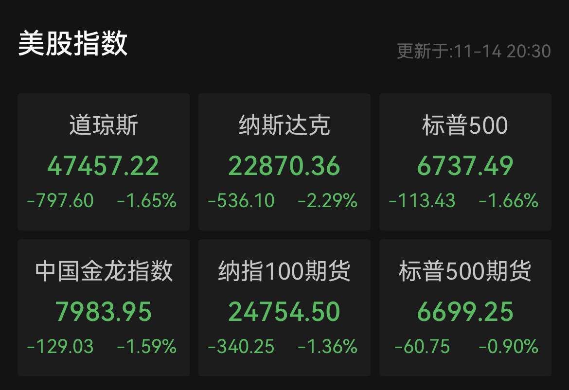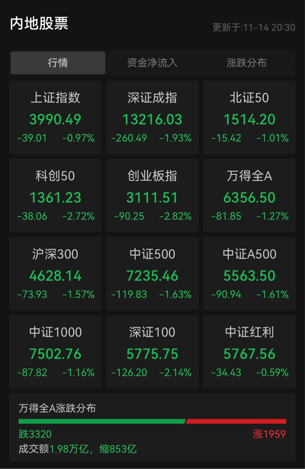 今日A股市场表现:11月14日A股市场全天震荡调整,三大股指集体收跌。截至收盘,沪指报3990.49点,跌0.97%;深成指报13216.03点,跌1.93%;创业板指报3111.51点,跌2.82%。两市成交额1.96万亿元,较上一交易日缩量839亿元,超3300只个股下跌。