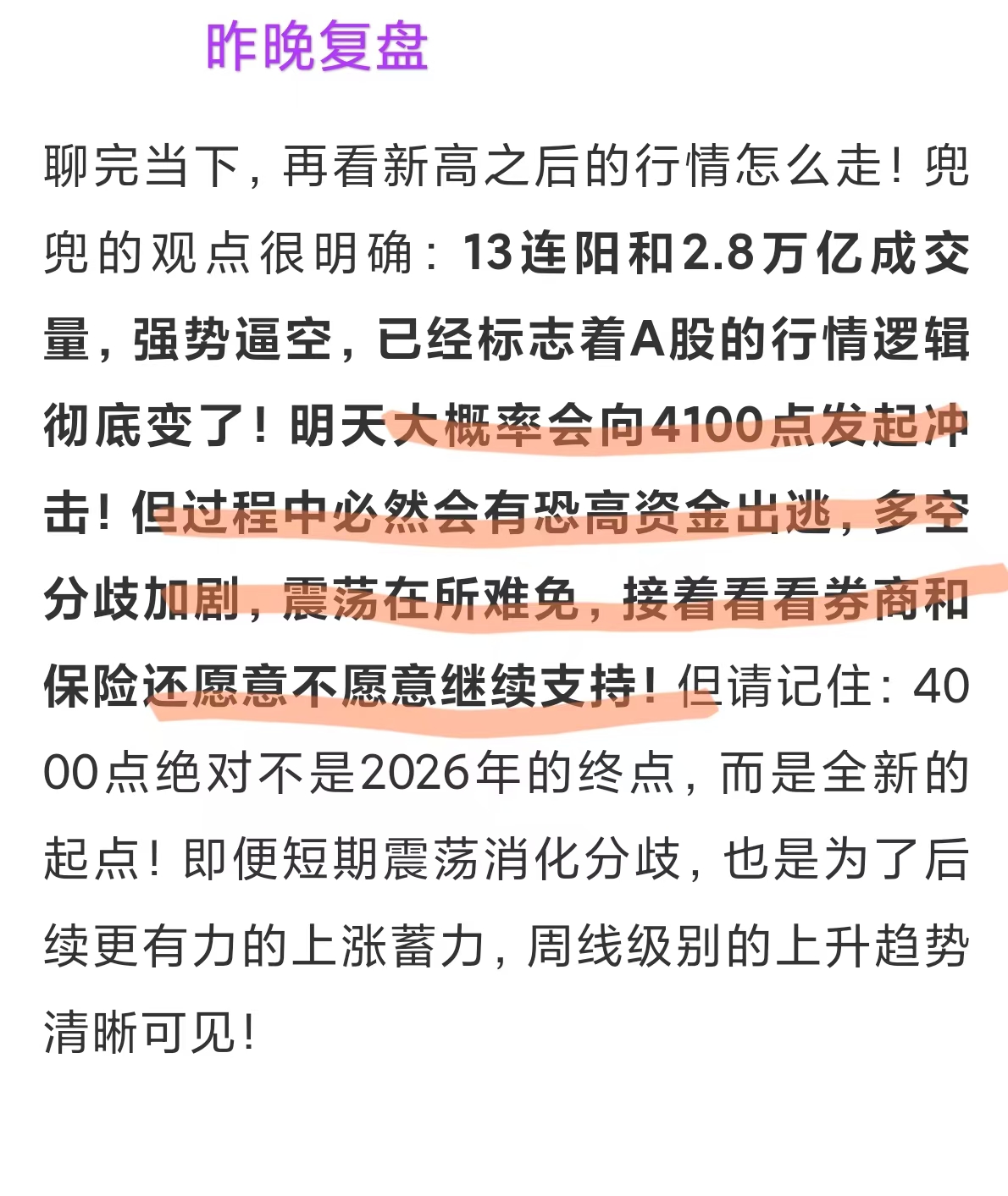 昨晚兜兜就敲黑板划重点:13连阳+2.8万亿天量成交,这波强势逼空直接宣告A股行情逻辑彻底生变!大概率剑指4100点!果不其然,今日高点直冲4098点!同时我也提醒过,要看券商持续性护航,过程中恐高资金必然出逃,多空分歧加剧,震荡在所难免——走势完美验证预判,这波操作谁看了不说一句牛!