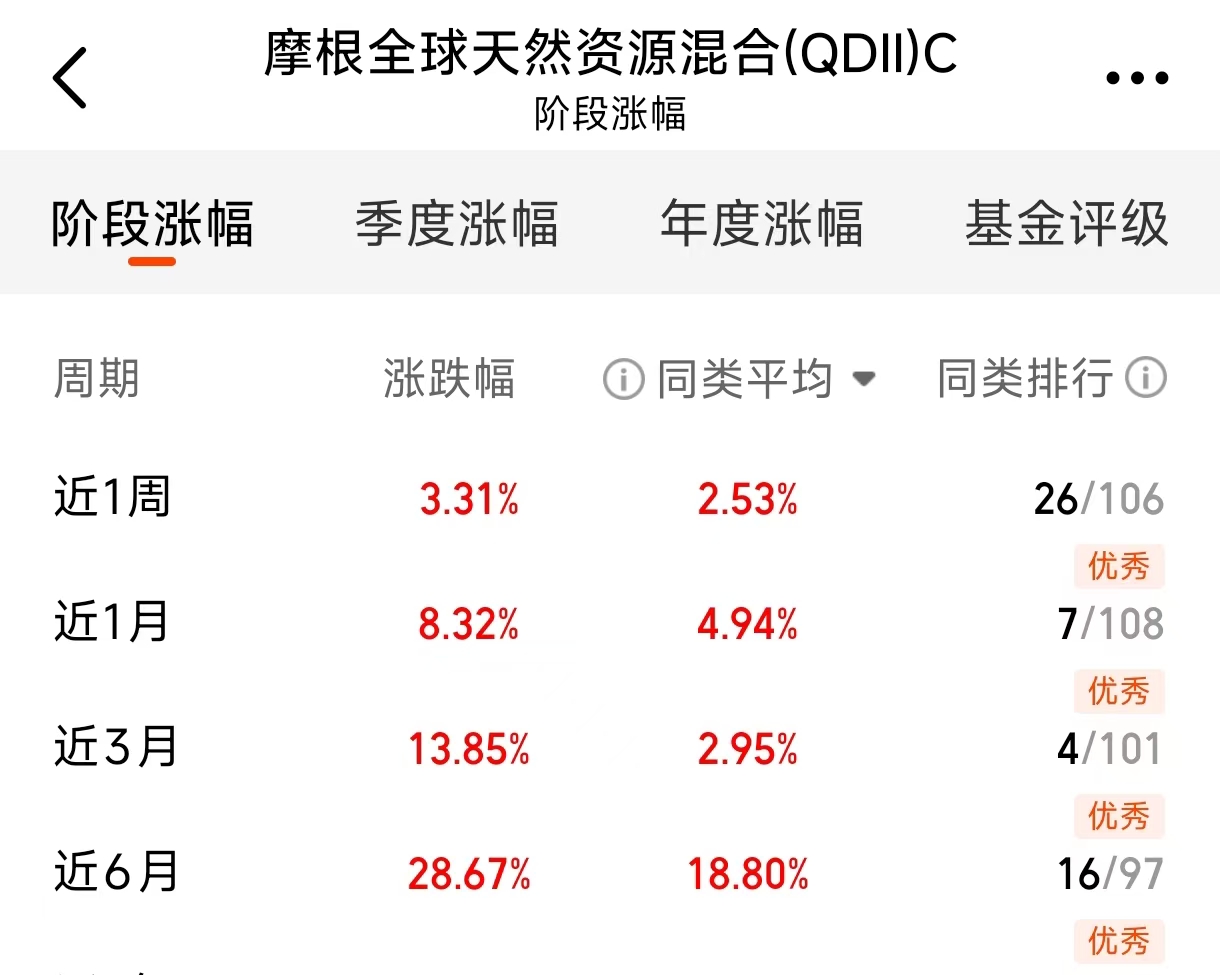 我今天买了点$摩根全球天然资源混合(QDII)C$(019578),近一周3.31%的涨幅和近一年42.13%的年化收益率,显示出较强的赚钱效应。这个基金的投资策略是围绕全球天然资源展开,其股票仓位主要配置在能源、基本金属、贵金属等相关行业的海外上市公司,实现真正的全球资产配置。地缘政治局势增加了不确定性,使得资源品,如石油和重金属,具备了避险属性和战略价值,其价格前景看好。与完全投资于A股资源板块的基金相比,摩根这只QDII基金近一月8.32%的涨幅(超越87.66%同类)以及其全球投资的范围,可能更好地分享到全球不同地区的资源增长红利,避免单一市场风险。全球有色金属价格持续攀升,A股的相关上涨只是联动效应,更大的潜力在于直接投资那些全球性的资源巨头,这只基金就提供了这样的途径。我注意到摩根这只基金C份额有10万的额度限制,这类产品额度非常紧张,像之前一些知名的原油QDII基金很早就限购了,现在有机会就得把握住。#2025超额关键词#