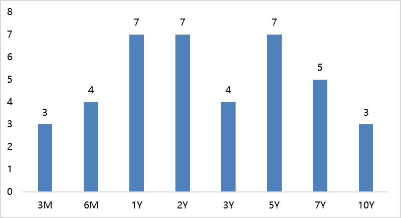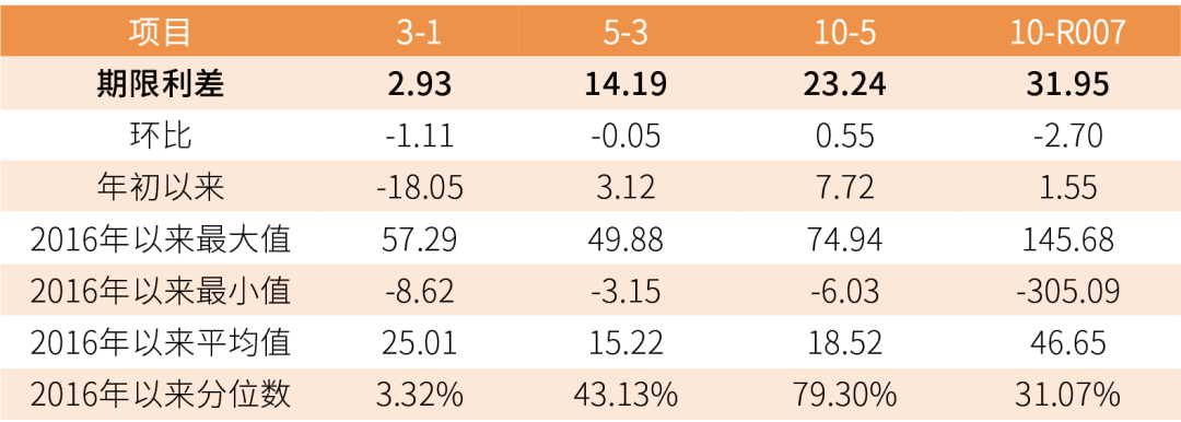 上周美债各期限收益率集体上行。1年期美债收益率上行7BP,3年期美债收益率上行5BP,10年期美债收益率上行3BP。
