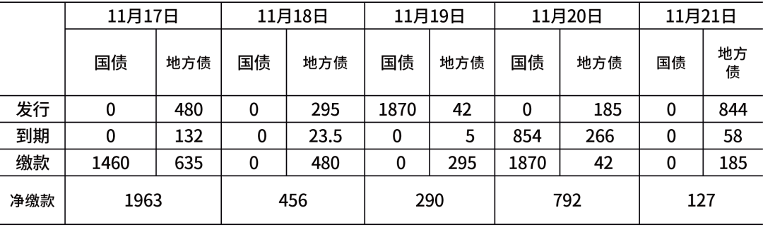 表:11月17日-11月21日政府债发行缴款 单位:亿元