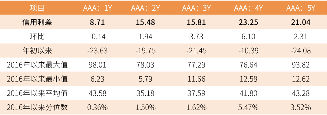 长期限高等级票据信用利差短期收窄,长期走阔。中债1年期AAA级中短期票据信用利差收窄0.14BP,中债2年期AAA级中短期票据信用利差走阔1.94BP;中债3年期AAA级中短期票据信用利差走阔3.72BP。
