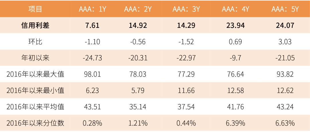 长期限高等级票据信用利差收窄。中债1年期AAA级中短期票据信用利差收窄1.10BP,中债2年期AAA级中短期票据信用利差收窄0.56BP;中债3年期AAA级中短期票据信用利差收窄1.52BP。