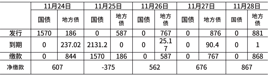 表:11月24日-11月28日政府债发行缴款 单位:亿元