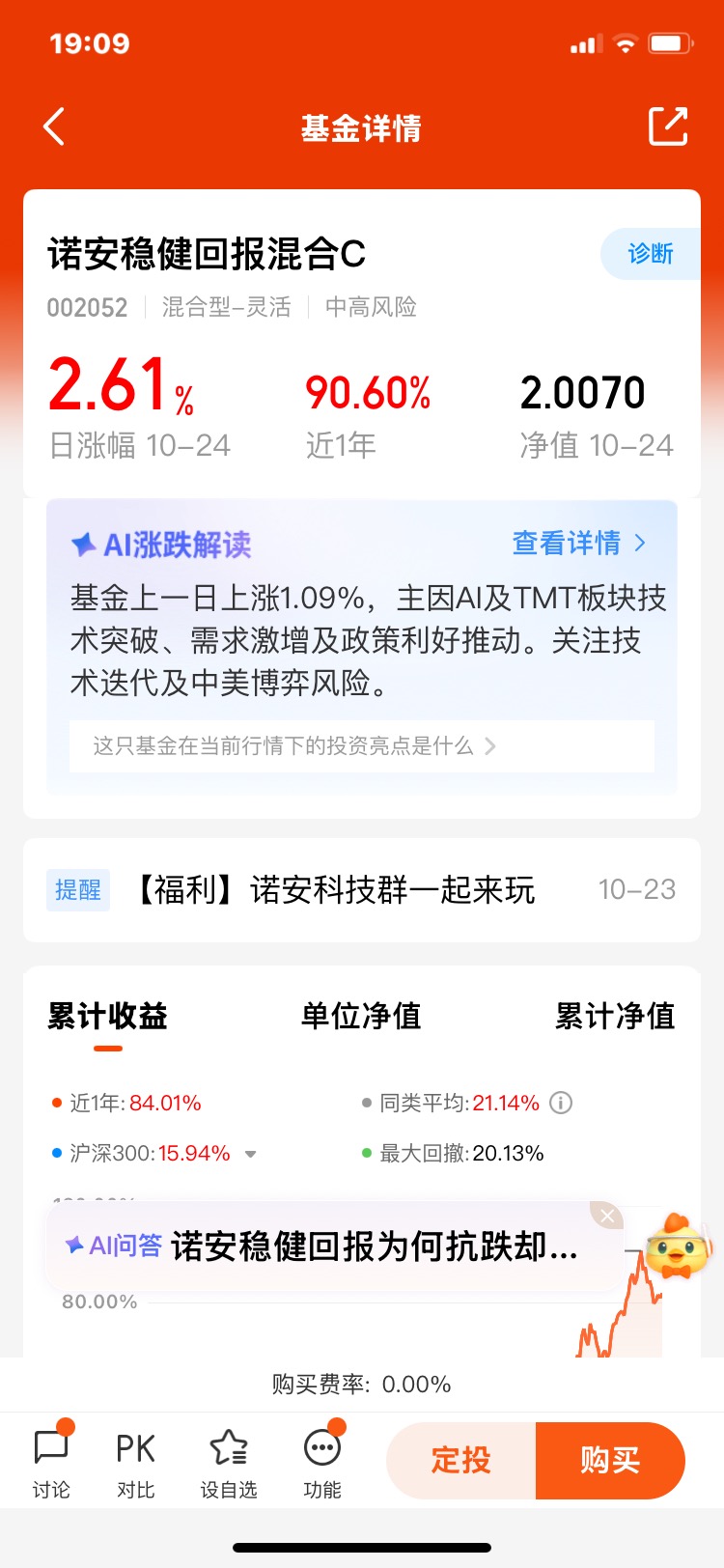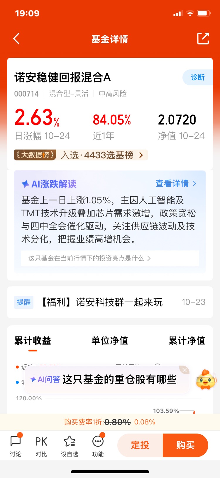 在众多科技主题基金中,我特别关注$诺安稳健回报混合A(OTCFUND|000714)$、$诺安稳健回报混合C(OTCFUND|002052)$,原因有以下几点: