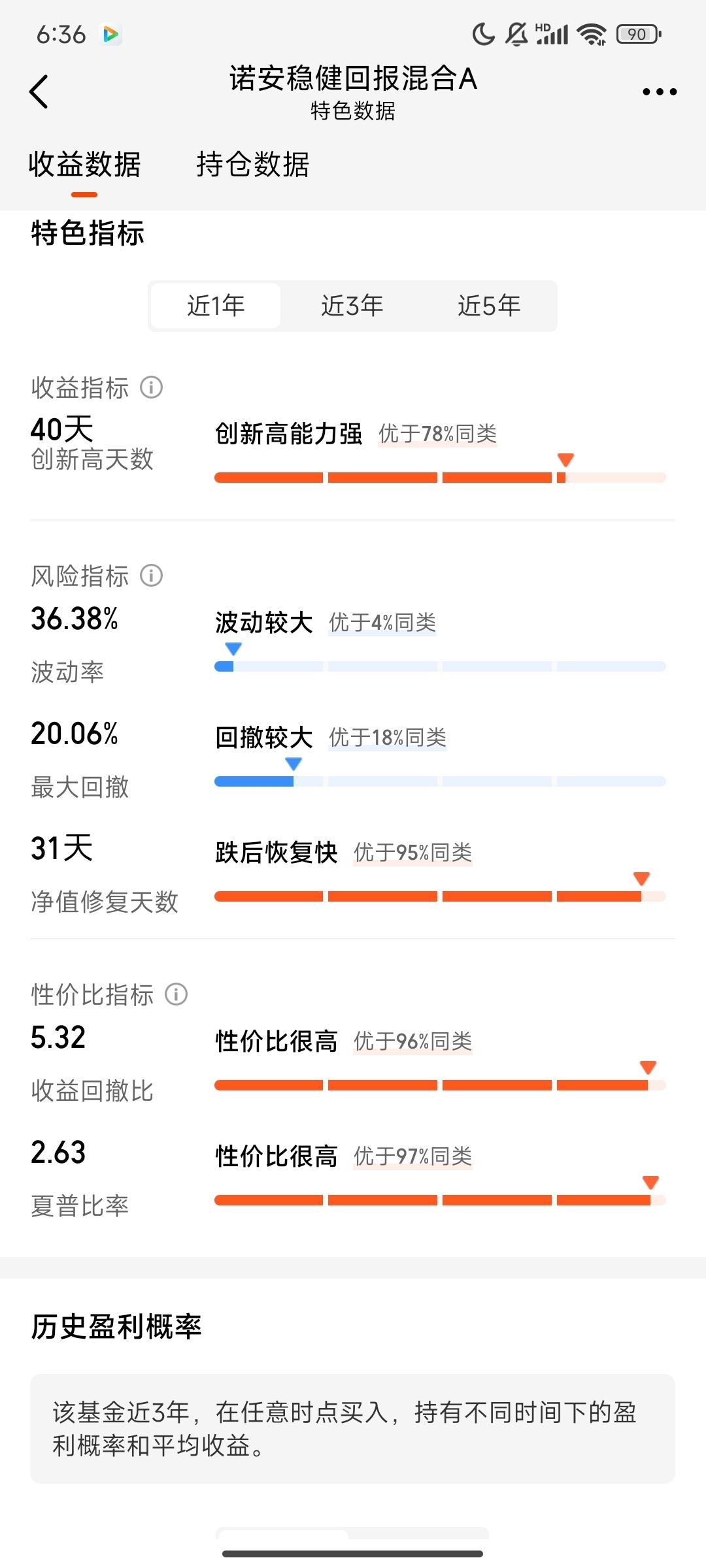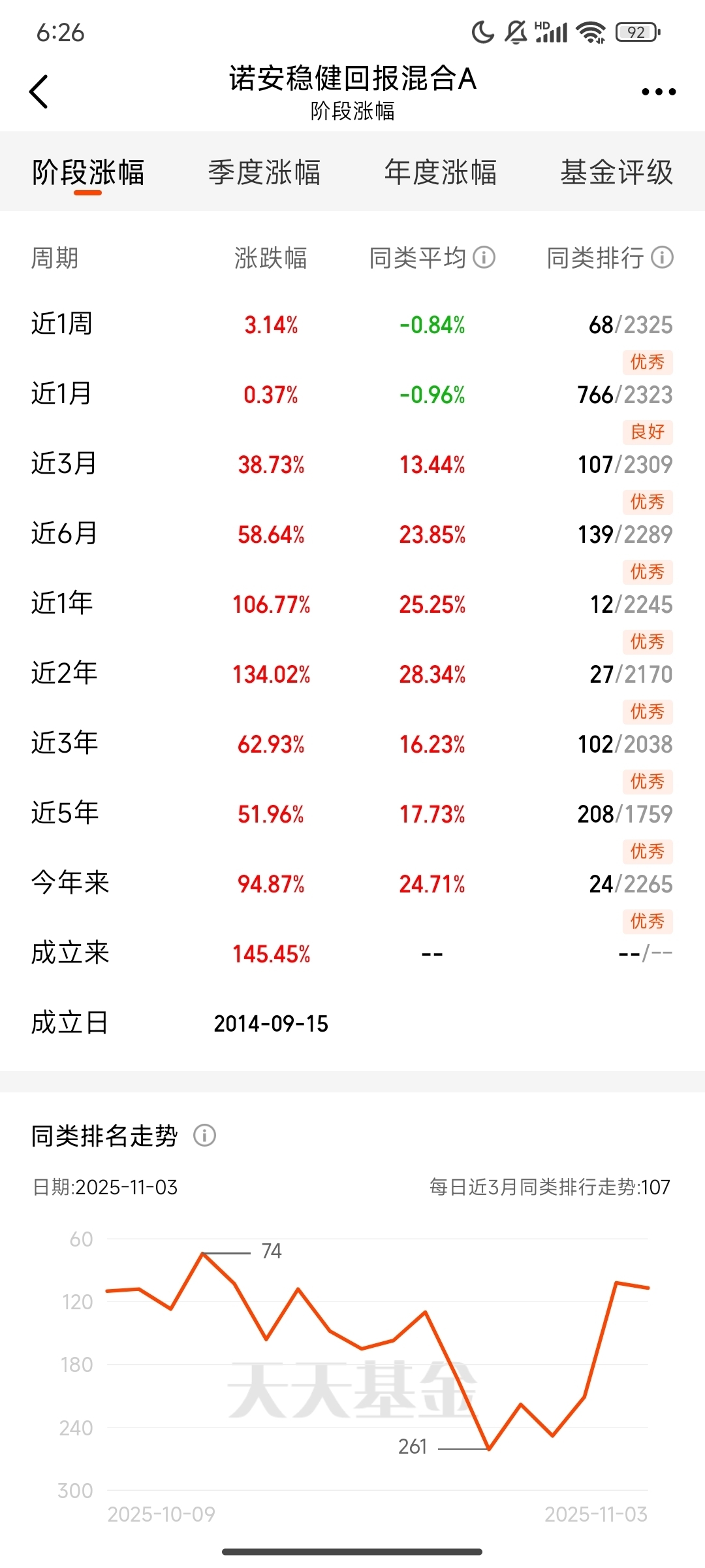 深入了解后我发现,诺安稳健回报混合的优秀绝非偶然。数据显示,该基金近一年涨幅高达106.77%,在同类基金中稳居前列。更令人惊叹的是其“全优成绩单”——无论短期的近一周、近一个月、近6个月,还是长期的近三年、近五年,基金净值增长在同类排行中均被标记为“优秀”。在波动频繁的资本市场中,能实现短期爆发力与长期稳定性的双重突破,这样的“尖子生”到底是如何炼成的?带着好奇,我从多个维度对其进行了深入测评。