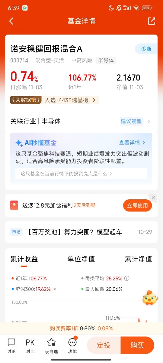作为一名普通投资者,我曾在基金市场中摸索许久,直到加入天天基金调研团,才真正感受到专业指引的力量。从10月23日开始关注诺安稳健回报混合C,短短10天内该基金就实现了8%的涨幅,这样的收益表现让我切实体会到,跟着调研团不仅能增长投资知识、开拓视野、提升投资能力,更能收获真金实银的回报,这笔“投入”远比想象中划算。
