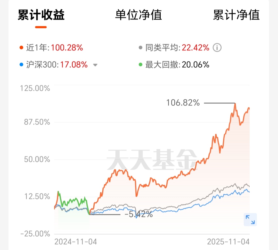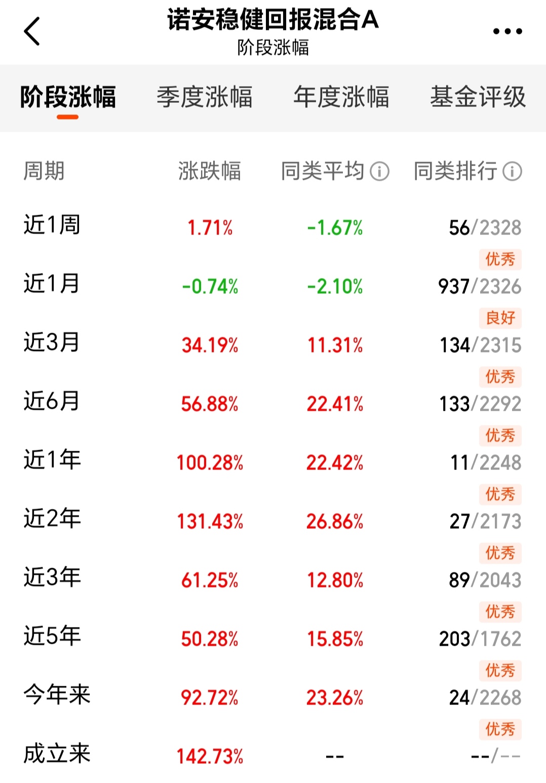 $诺安稳健回报混合A(OTCFUND|000714)$由于踏准了市场的节奏,取得了骄人的业绩,近3个月涨幅34.19%,近6个月涨幅56.88%,近1年涨幅100.28%,近2年涨幅131.43%,今年以来涨幅92.72%,业绩非常优秀,在市场上涨当中弹性十足,超额收益十分明显,可谓是基金中的“战斗机”。