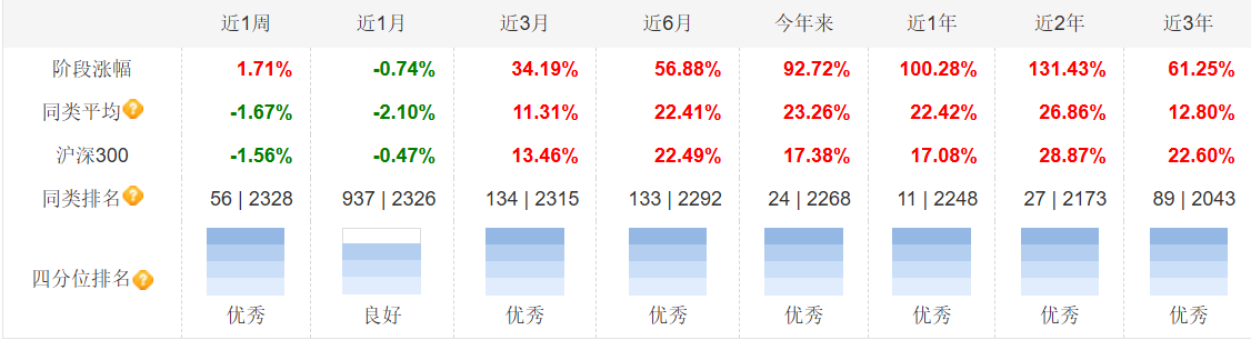 业绩上,$诺安稳健回报混合A(OTCFUND|000714)$,今年涨92.72%、近1年涨100.28%,属于一年一倍基,这个业绩很亮眼的,远远跑赢市场和同类平均水平。