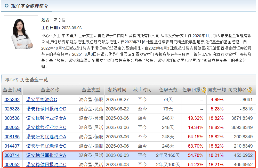 花絮前面有幸参加了天天基金组织的调研团活动,并在此次活动中听取了诺安基金经理邓心怡对AI产业链发展的一些观点,并深度剖析了 $诺安稳健回报混合A(OTCFUND|000714)$这只产品的核心投资思路。邓经理是清华大学学士,宾夕法尼亚大学硕士高材生,历任研究部副总经理,现任研究部总经理。其拥有超3年从业管理经验,其管理的诺安稳健回报混合A(000714)在任期两年多时间里,总涨幅达54.78%,而同期同类平均涨幅仅为18.21%,基金近一年涨幅83.80%,各阶段业绩稳居同类前列。