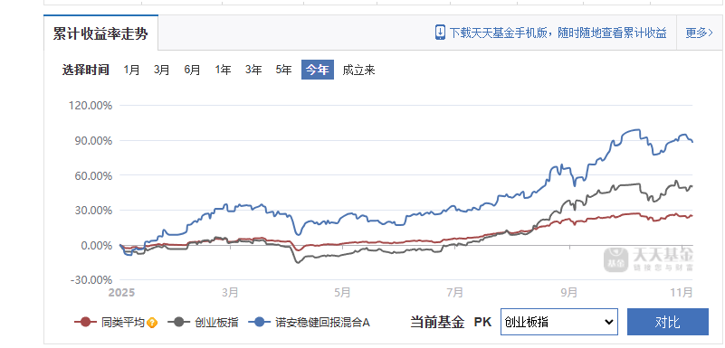 今年来的累计收益对比图也可以清楚看出,该基金收益较同类以及创业板指数有着较大优势。