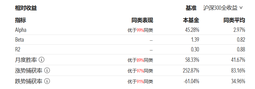 从相对收益指标来看,该基金月度胜率排名同类前11%,涨势捕获率排名同类前3%。