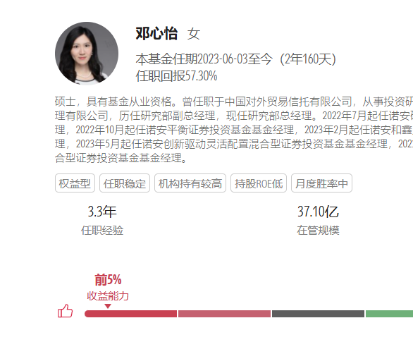 核心一:为使得读者更加深入理解诺安稳健回报混合A(000714)邓心怡经理的投资逻辑以及操作思路,天咨君精心搜集、整理了经理近些年的各项路演资料,再结合本次调研,为大家详细呈现基金经理具体投资思路,系统了解基金经理的投资成长经历。