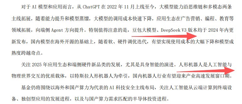我们知道,今年科技股牛市最大的信心引爆点,是像DS和宇树机器人这样的机会。这两大机会都是在春节假期期间持续发酵,进而在节后启动的。而在诺安稳健回报的2024年四季度报告里,邓心怡已经明确写下了对本土大模型带来的端侧应用机会,以及机器人方向的看好。考虑到季报撰写和合规审核的时间,这意味着她的团队至少在去年年底、今年年初就已经关注甚至开始布局这些机会了,体现了极强的敏锐度。