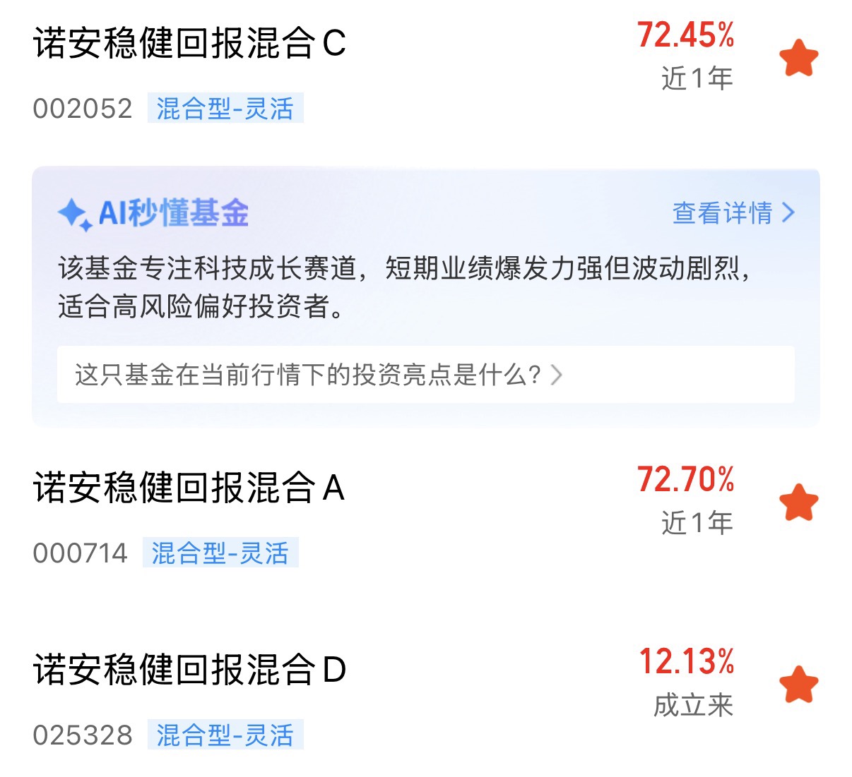 我这两天也在翻看一些适合自己的科技主题基金,发现诺安基金旗下的诺安稳健回报灵活配置混合(A:000714,C:002052)就非常不错,它正是我说的第二种选手——深度扎根产业链的典范。