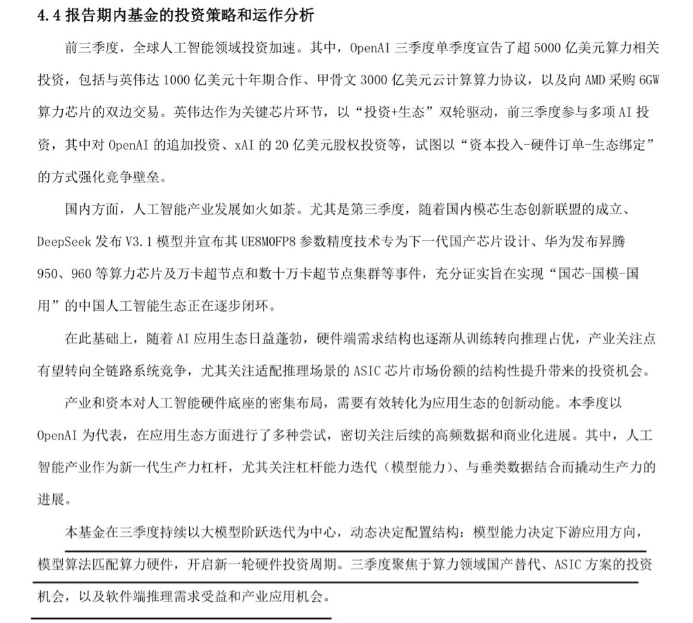 再比如说,去年GPT-o1推出后,邓心怡看到了强化学习算法会对ASIC芯片带来巨大的需求。她敏锐地意识到,在新的模型架构下,英伟达不再是唯一的芯片选择。于是,早在去年四季度,她就重仓了A股市场的一家ASIC芯片公司。而在当时,几乎没有什么机构投资者在关注这家公司。这一笔极具前瞻性的重仓,也为基金带来了很好的超额收益。