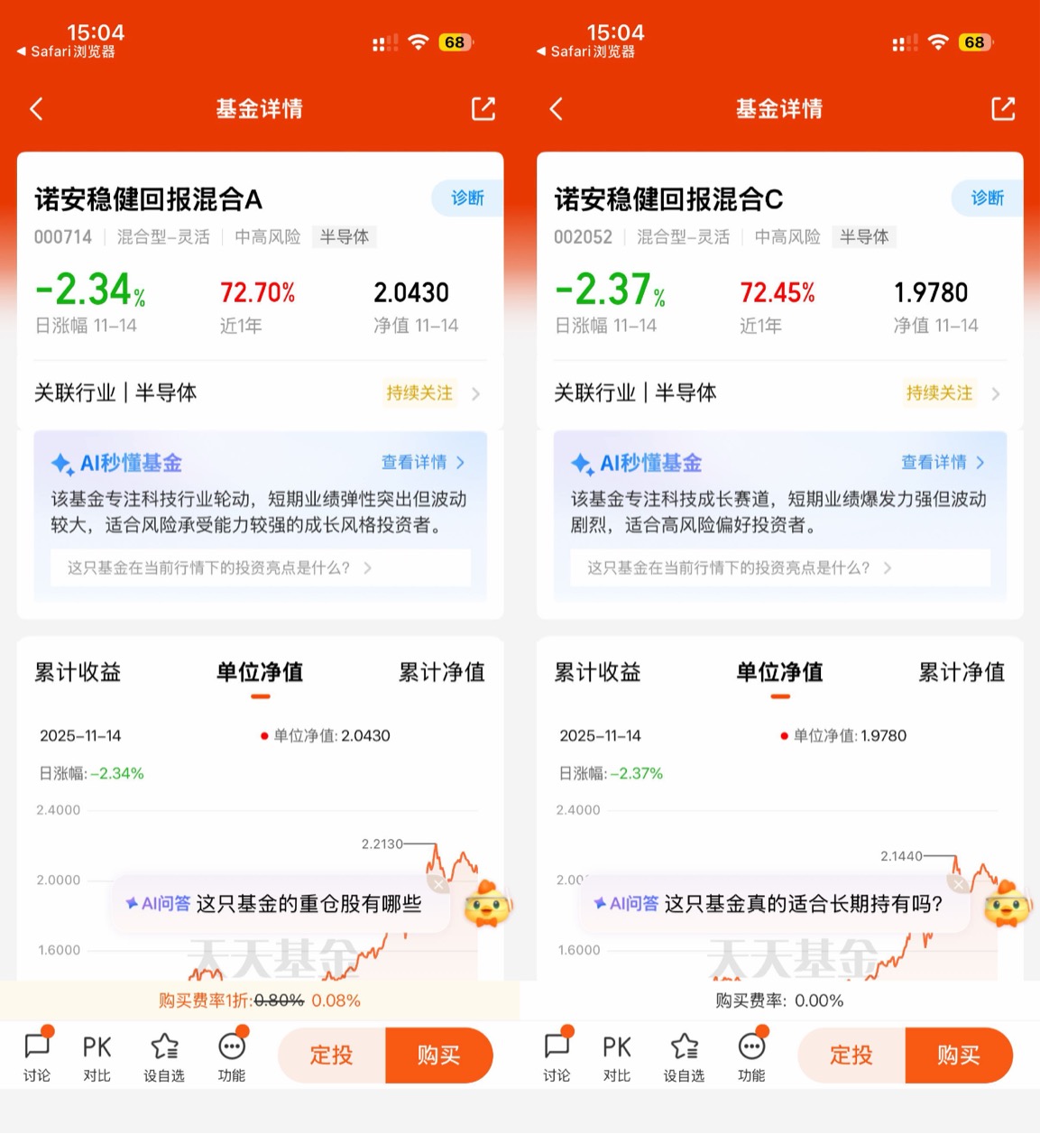 经过一番研究和比较,我的目光最终落在了诺安基金旗下的一只科技主题基金上——诺安稳健回报灵活配置混合(A:000714,C:002052)。选择它,很重要的一个原因是这只基金的定位非常清晰,就是深耕“新兴产业”。根据它最新的基金三季报披露,我仔细看了其前十大重仓股,发现电子行业就占了7席,前十大重仓股占比超过56.58%,科技风格非常纯粹、鲜明。这让我很放心,它不像市场上有些所谓的“主题基金”,挂着“蓝筹消费”或者“科技成长”的名号,结果买了一大堆的白酒股或者银行股,妥妥的“挂羊头卖狗肉”!对我来说,选这只基金,相当于通过一个产品,就能相对全面地分享整个AI大趋势的红利,比我自己去单押某个细分领域,比如只买机器人或者只买算力芯片,要稳妥得多,也更符合我这种普通投资者的风险偏好。