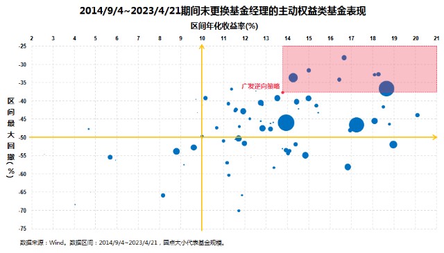 上图是广发逆向策略与全市场偏股主动基金(股票仓位占比大于60%)的同时期年化收益/区间最大回撤对比图。