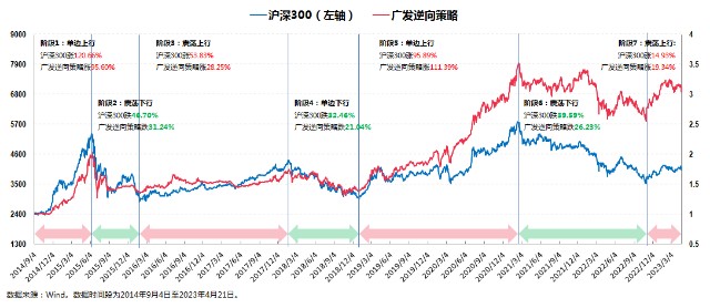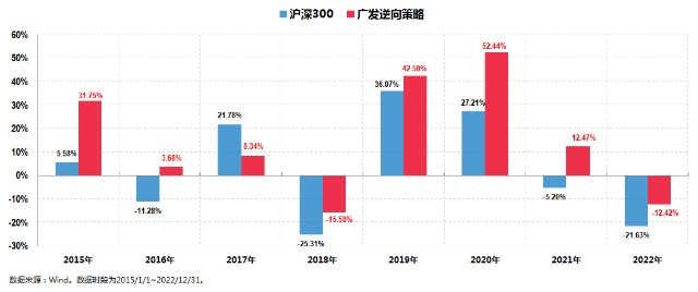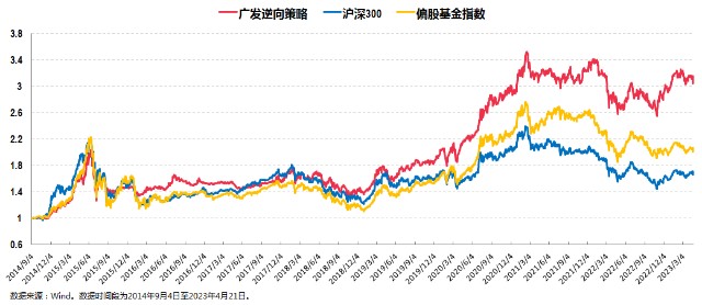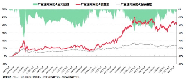 从图中可以看出,这只名为广发逆向策略的产品长期下来不仅跑赢沪深300,更是较大幅度地跑赢了中证偏股型基金指数。
