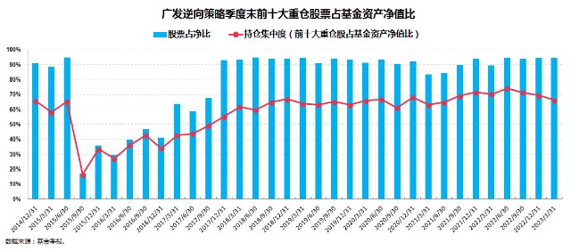 从上图中可以看出,其持仓集中度长期维持在较高的水准,2018年以来的平均持股集中度为66.37%。最新的2023年一季报显示,其持仓集中度为66.34%。