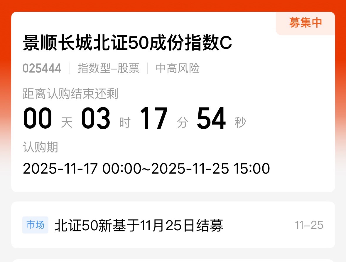 对北证50的硬科技方向有些兴趣,弹性确实大,景顺这只今天提前结募了,看了市场还是很认可,我也小跟一笔试试$景顺长城北证50成份指数C$
