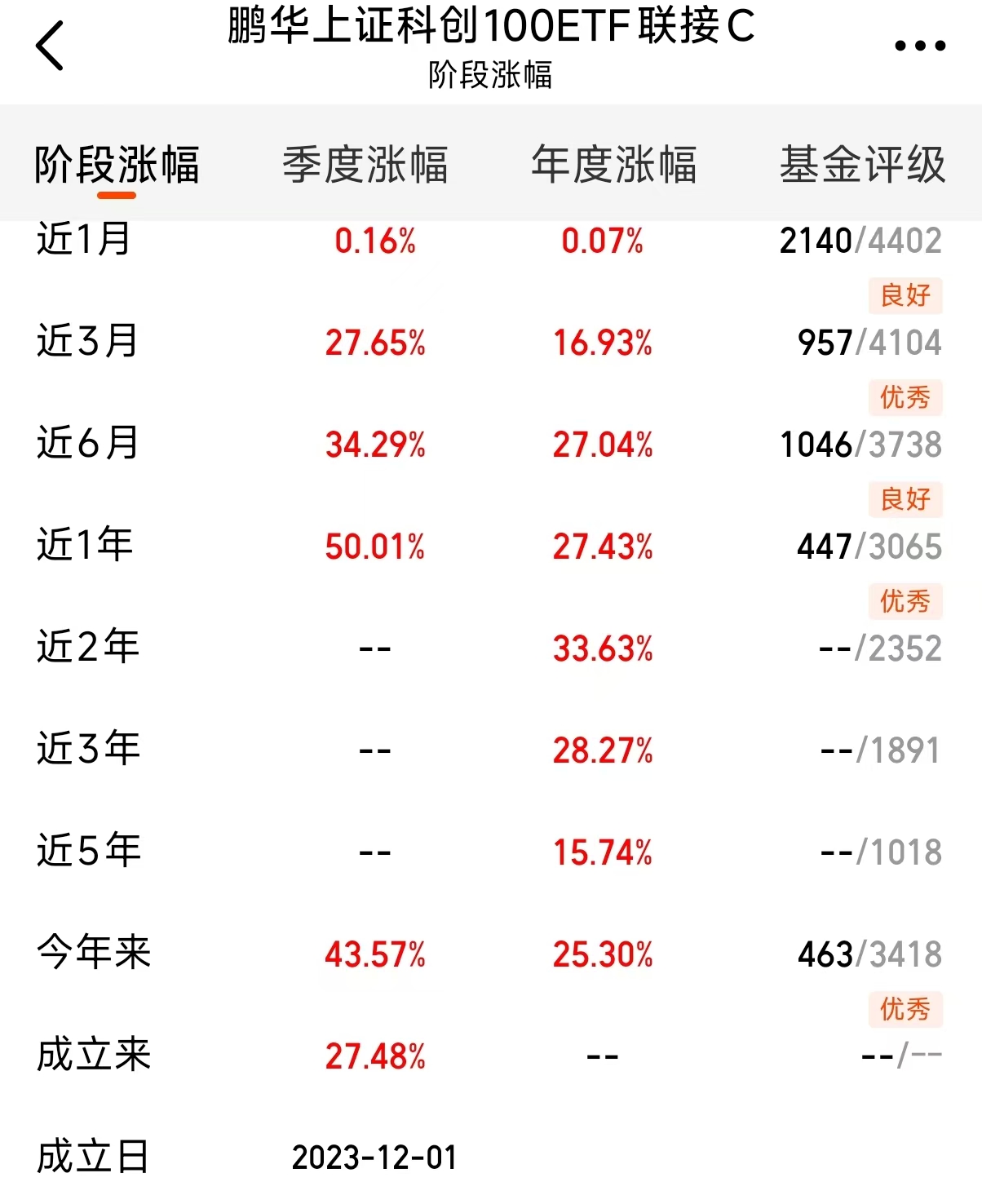 从业绩表现来看,$鹏华上证科创100ETF联接C$(019862)过去一段时间表现可圈可点。近一月和今年以来的涨幅都显著超越了很多同类产品,显示出在科创板行情下的捕捉能力。成立以来的年化收益率也较为可观。科创100指数作为科创板的重要代表,聚焦高成长科创领域,成分股多为细分领域龙头或潜力企业。对于关注科创板投资机会的投资者,这是一个可以关注的选项。#稀土价格暴涨37%!稀土板块狂飙#