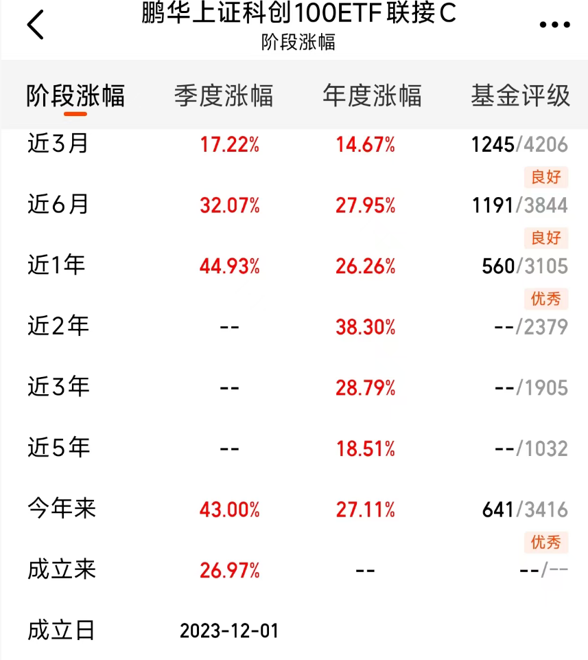 科创板近期的表现,确实可圈可点。这种时候,通过指数产品参与是个相对稳妥的办法。$鹏华上证科创100ETF联接C$(019862)跟踪的指数聚焦科创板中小盘公司,这类企业在行情好转时弹性往往更明显。指数成份股在新一代信息技术、生物科技、先进制造等领域占比高,符合经济转型方向。产品本身是联接基金,买卖方便,门槛也低,适合大多数投资者。当下市场对科技类资产关注度提升,借助这类产品布局科创板,不容易错过整体趋势。行情好了,动作要跟上,但方式得选对。#科技小登大揭秘#