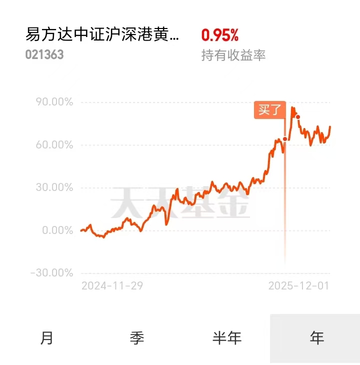今日黄金市场延续强势,黄金股也是水涨船高,黄金股与金价同步,且利润弹性远超金价本身。短期波动不改长期趋势,我也继续看涨后续表现。$易方达中证沪深港黄金产业股票指数发起式C(OTCFUND|021363)$今天上涨3.36%,比黄金指数涨得多,我持仓收益率 0.95% ,想博取更高收益我觉得布局黄金股挺不错的,我也打算继续拿着啦!