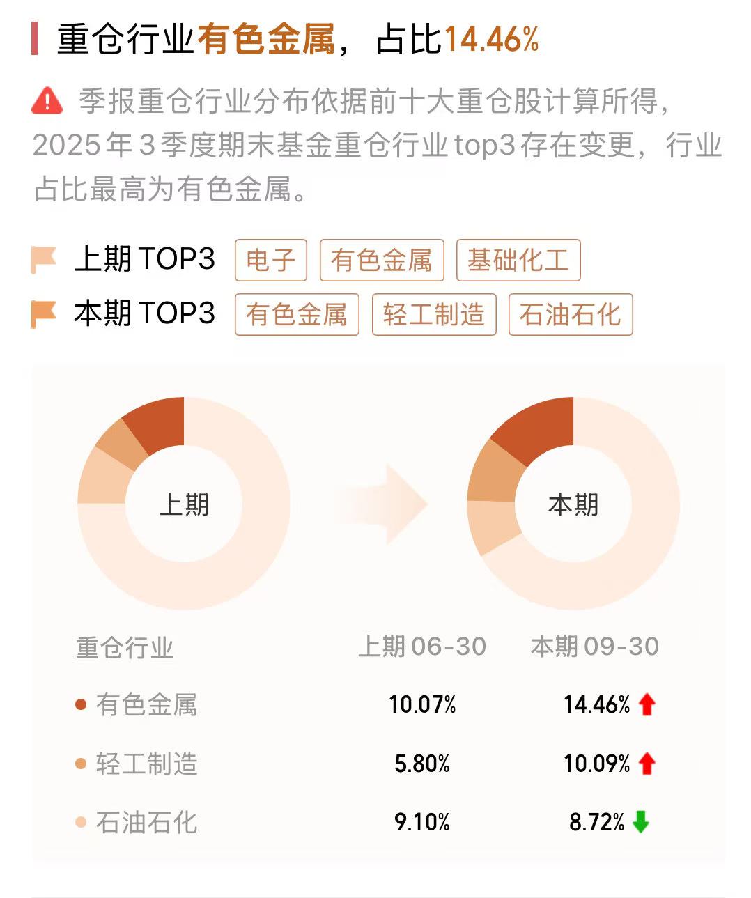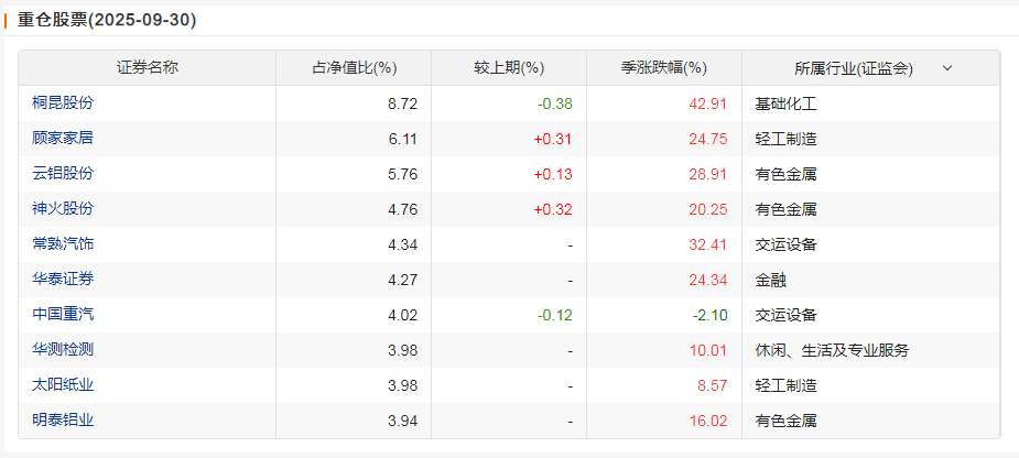 最新持仓结构分析。根据2025年9月30日的最新数据,该基金的股票仓位高达92.16%,现金占比仅8.75%。从行业配置看,制造业占比70.69%(占股票市值76.70%),金融业10.78%(占股票市值11.70%),科学研究和技术服务业3.98%(占股票市值4.32%)。这种以制造业为主、金融为辅的配置结构,体现了基金对实体经济转型升级的看好。