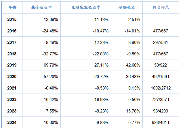 长期稳定的超额收益能力。该基金自2015年2月成立以来,累计收益率达115.11%,年化收益率约6.5%。更重要的是,其超额收益在不同市场环境下都有体现:2019年收益率69.79%(超越基准42.68%),2020年57.20%(超越基准36.48%),2023年7.55%(超越基准15.78%)。即使在2022年市场大幅下跌的环境中,该基金仅下跌16.42%,优于业绩基准0.56个百分点,展现出较强的抗跌性。