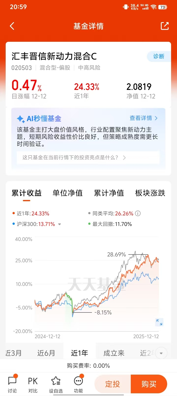 当整个市场都处于下跌的阴霾之中,沪深300指数年内下跌了8%,许多投资者的资产都在不断缩水,心情也变得十分沉重。然而,汇丰晋信新动力混合 A 却在这样的市场环境中逆势而上,同期上涨了12%,这一表现无疑是市场中的一抹亮色。这种超越市场基准的收益能力,背后有着深刻的投资逻辑,它的本质就是基金经理通过卓越的资产配置、精准的行业轮动以及深入的个股精选等投资策略,创造出的收益。
