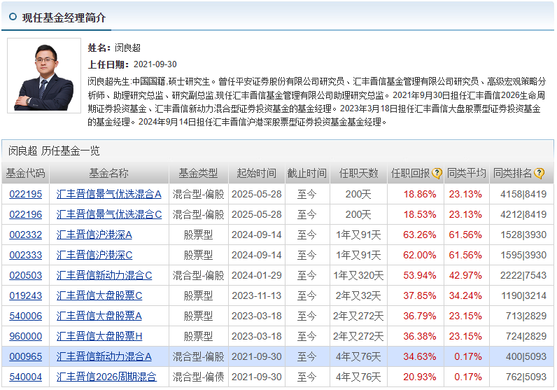作为汇丰晋信研究副总监,闵良超在产业研究方面有着深厚的功底,就像一位对宝藏地图了如指掌的探险家,能够深入挖掘产业发展的内在逻辑,找到那些被市场忽视的宝藏。他带领团队构建的 “新动力主题” 投资框架,聚焦深化改革与产业升级两大主线,就像为基金的投资指明了方向,让基金在投资的海洋中有了明确的航线。在这条航线上,他们挖掘出了万华化学、中国重汽等众多牛股,这些牛股就像一颗颗璀璨的明珠,为基金的业绩增光添彩。近三年来,这些成功的投资案例充分证明了他在产业研究方面的深度和广度,以及他带领团队挖掘优质投资标的的能力,就像一位优秀的厨师,能够用丰富的食材做出美味的菜肴,他和他的团队能够用深入的研究成果为投资者创造出丰厚的收益。