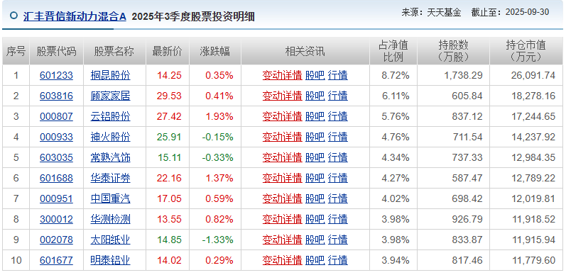 持仓质量也是评估基金超额收益能力的关键因素,它就像是一座大厦的基石,决定了基金的稳定性和可持续性。截至2025年一季度,汇丰晋信新动力混合A基金前十大重仓股占比 39.49%,显著低于同类平均45%的水平,这就像一位聪明的投资者,不会把所有的鸡蛋都放在一个篮子里,有效地避免了单一行业过度集中带来的风险。该基金的布局非常广泛,覆盖了周期、消费、金融等六大板块,就像一张精心编织的大网,能够捕捉到不同行业的投资机会。在周期板块,它布局了桐昆股份、云铝股份等优质企业,这些企业就像周期行业中的明星,在经济复苏时能够焕发出强大的活力,为基金带来丰厚的收益;在消费板块,格力电器、顾家家居等行业龙头企业的加入,为基金提供了稳定的收益来源,就像消费市场的定海神针,无论市场如何变化,它们都能凭借强大的品牌实力和市场份额,保持稳定的业绩增长;金融板块的华泰证券则为基金增添了一份稳健,就像金融市场的中流砥柱,在市场波动时能够发挥稳定器的作用。通过这种 “顺周期价值修复 + 成长股弹性配置” 的组合,基金在经济复苏期能够实现 收益捕捉与收益创造的双重驱动,就像一辆拥有双引擎的汽车,在经济复苏的道路上能够快速前进,为投资者带来更多的收益。